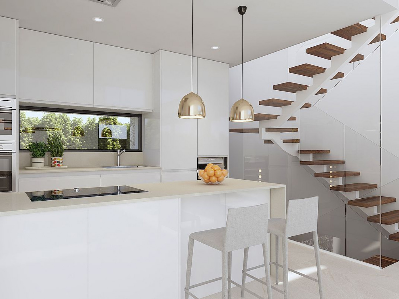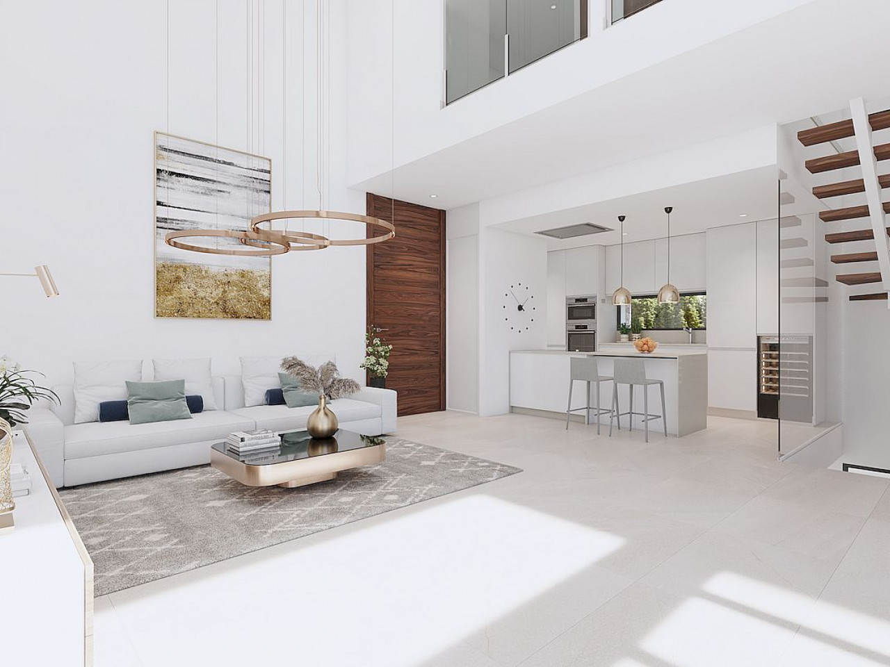 Pirmame aukšte yra svetainė ir atvira virtuvė. Jis buvo sukurtas siekiant sugerti daug natūralios šviesos, todėl visame name galite rasti didelius stumdomus langus. Be to, šiame aukšte taip pat yra miegamasis su tiesioginiu išėjimu į sodą ir vonios kambarys.