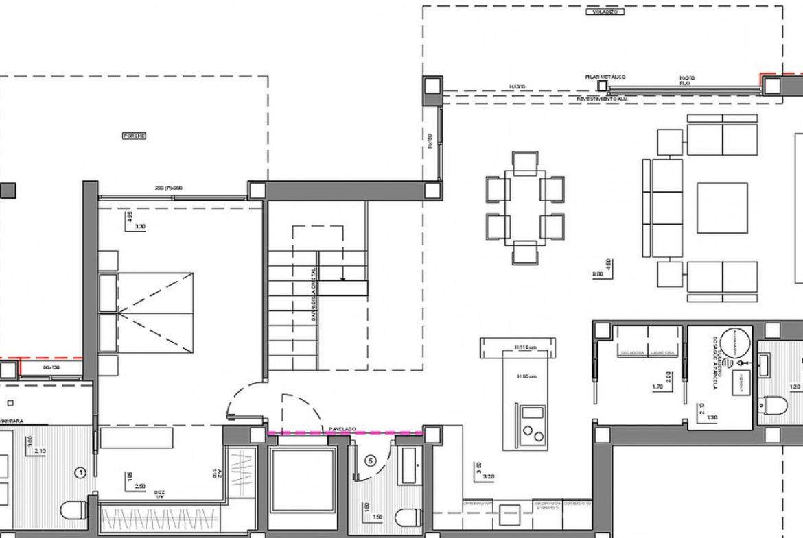 Įėjimas viršutiniame aukšte, kur yra holas, jungiasi su garažu su vieta dviems automobiliams. Liftu arba laiptais galime nusileisti į vidurinį aukštą, kur yra pagrindinis miegamasis ir kiti du miegamieji. Pagrindiniame miegamajame yra vonios kambarys, drabužinė ir išėjimas į privačią terasą. Kituose dviejuose miegamuosiuose taip pat yra atskiras vonios kambarys, erdvios drabužinės ir bendra terasa.