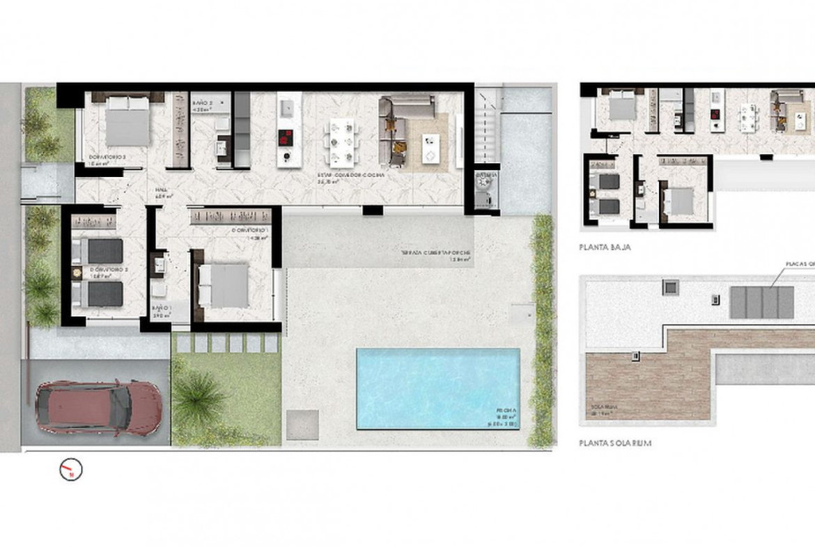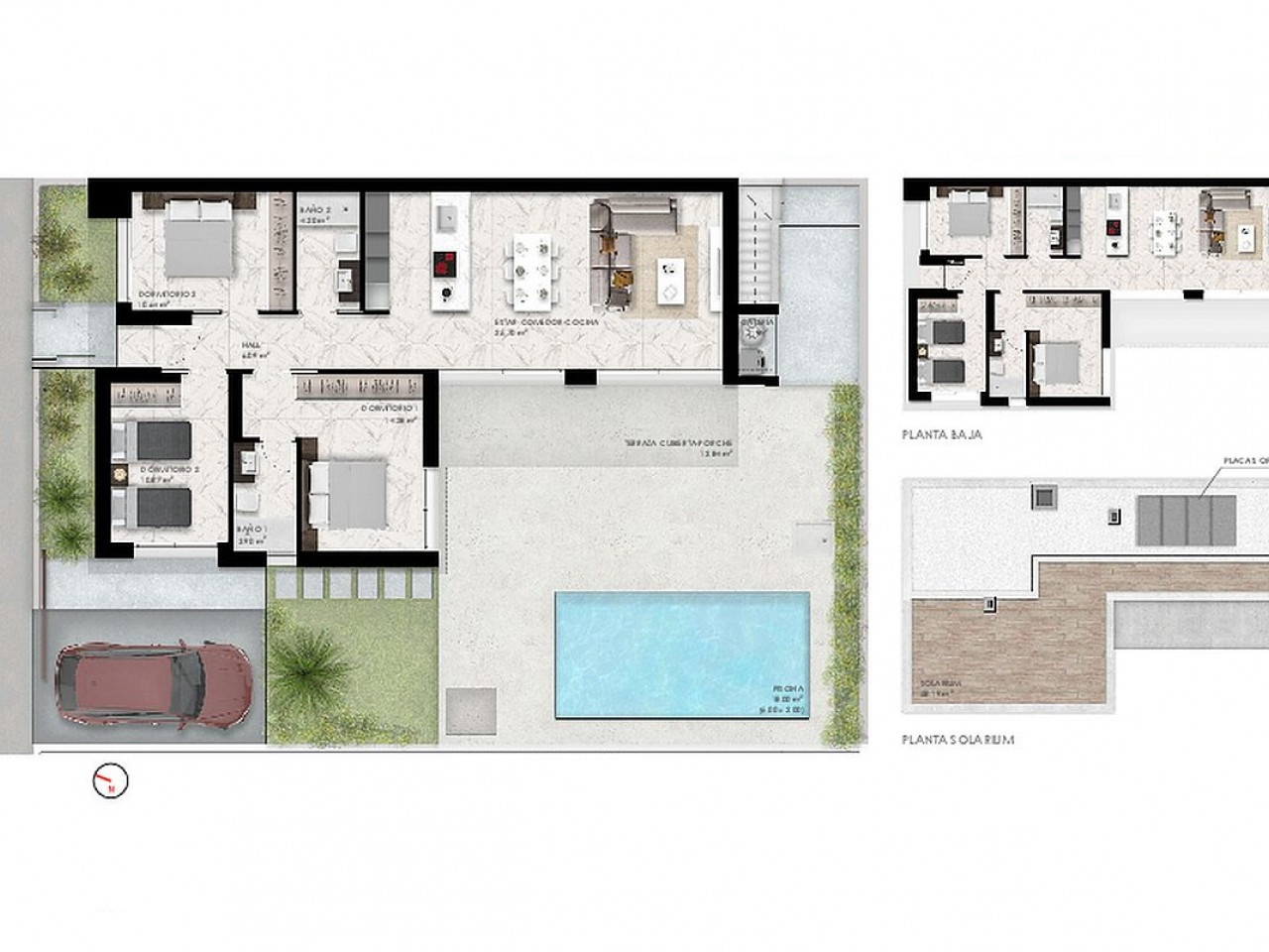 Kompleksą sudaro trys skirtingi vilų modeliai su trimis miegamaisiais ir dviem arba trim vonios kambariais su privačiu baseinu ir soliariumu viršuje.