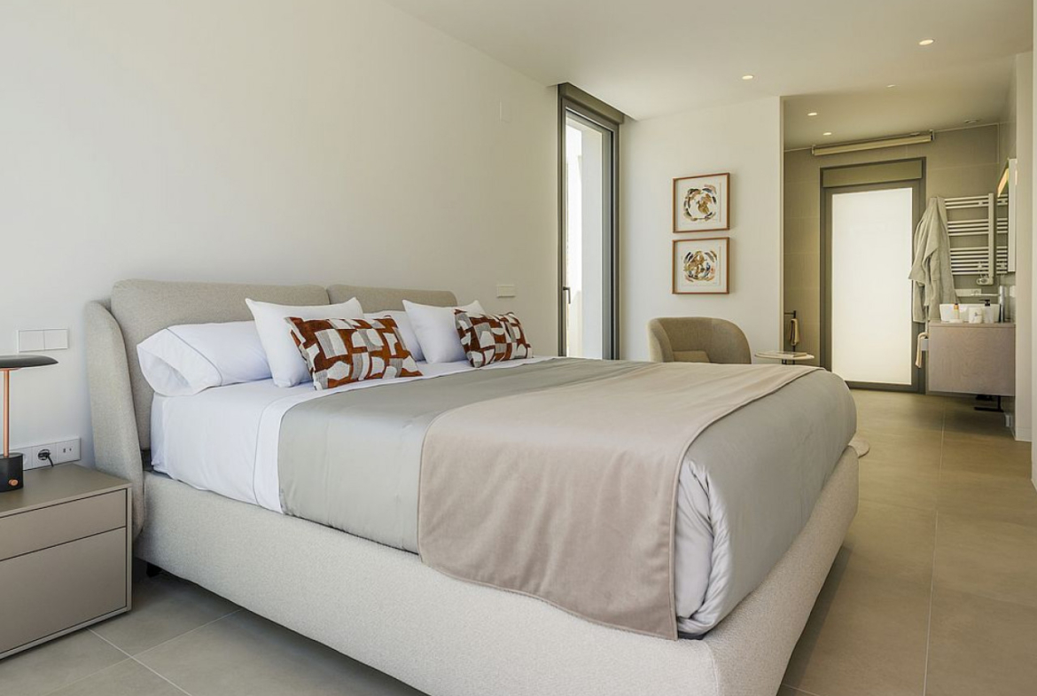 Pirmame aukšte yra atviro plano virtuvė, svetainė ir valgomasis, kurio durys veda į erdvų sodą ir baseino zoną. Viduje yra nuostabus pagrindinis miegamojo apartamentas su nuosava drabužine, vonios kambariu ir privačia terasa. Dar du dviviečiai miegamieji su įmontuotomis spintomis ir dar vienas modernus namo vonios kambarys bei papildomas svečių tualetas.
