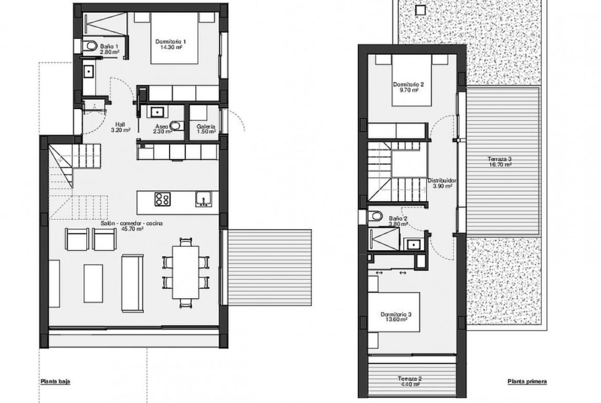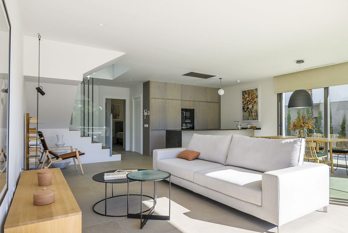 Pirmame aukšte yra atviro plano virtuvė, svetainė ir valgomasis, kurio durys veda į erdvų sodą ir baseino zoną. Viduje yra nuostabus pagrindinis miegamojo apartamentas su nuosava drabužine, vonios kambariu ir privačia terasa. Dar du dviviečiai miegamieji su įmontuotomis spintomis ir dar vienas modernus namo vonios kambarys bei papildomas svečių tualetas.