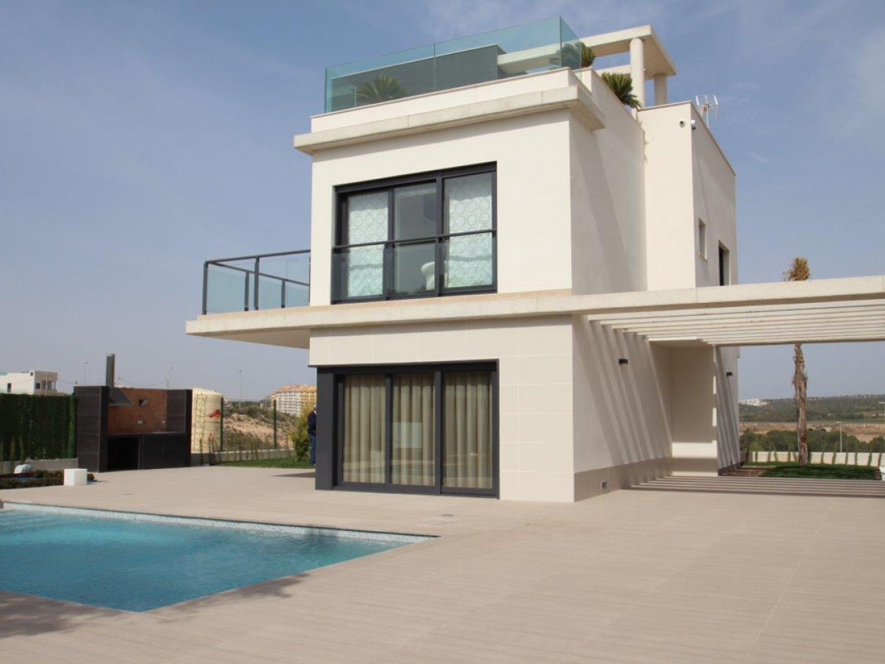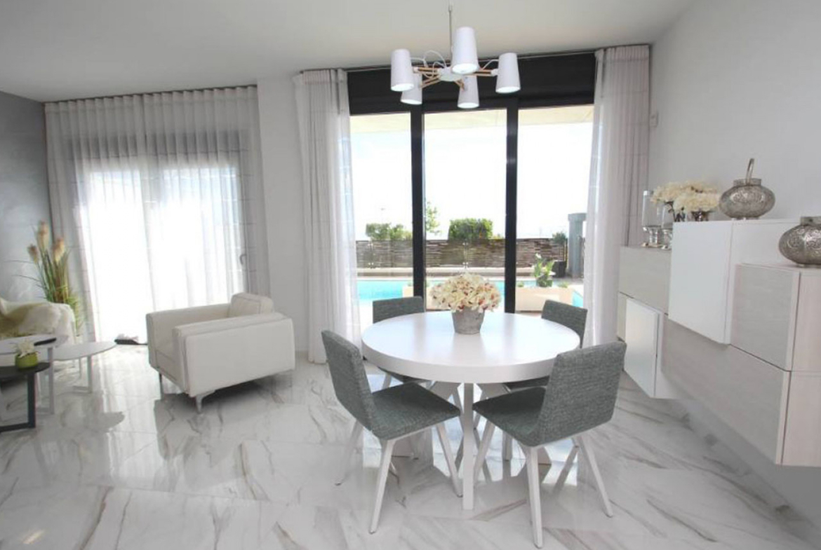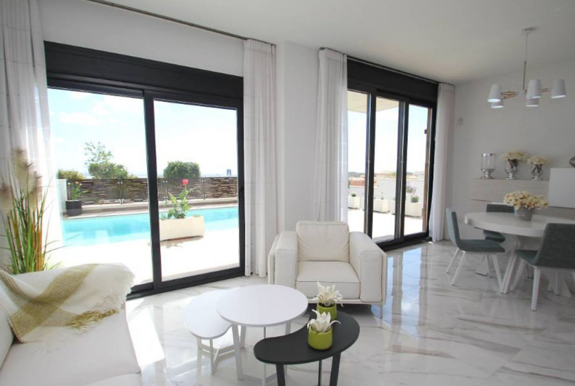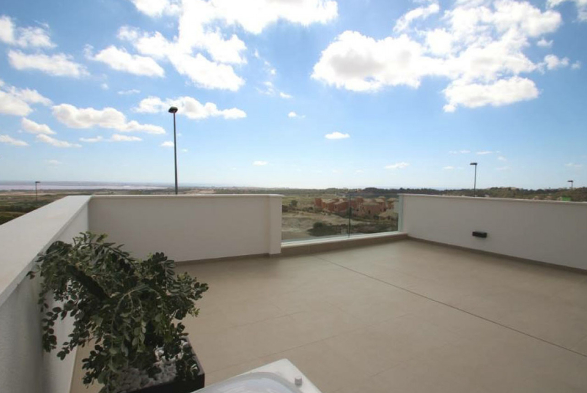 Šiame šiuolaikiniame modernaus dizaino ir aukštos kokybės apdailos būste yra trys dviviečiai miegamieji (visi su įmontuotomis spintomis), du vonios kambariai, visiškai įrengta virtuvė su tiesioginiu išėjimu į nedidelę galinę terasą ir atviro plano svetainės / valgomojo zona, pro plačias lauko duris vedanti į privatų sodą su baseinu ir automobilių stovėjimo aikštele. Į 74 m2 ploto soliariumą ant stogo galima patekti vidiniais laiptais, iš jo atsiveria fantastiški vaizdai į Villamartin apylinkes.