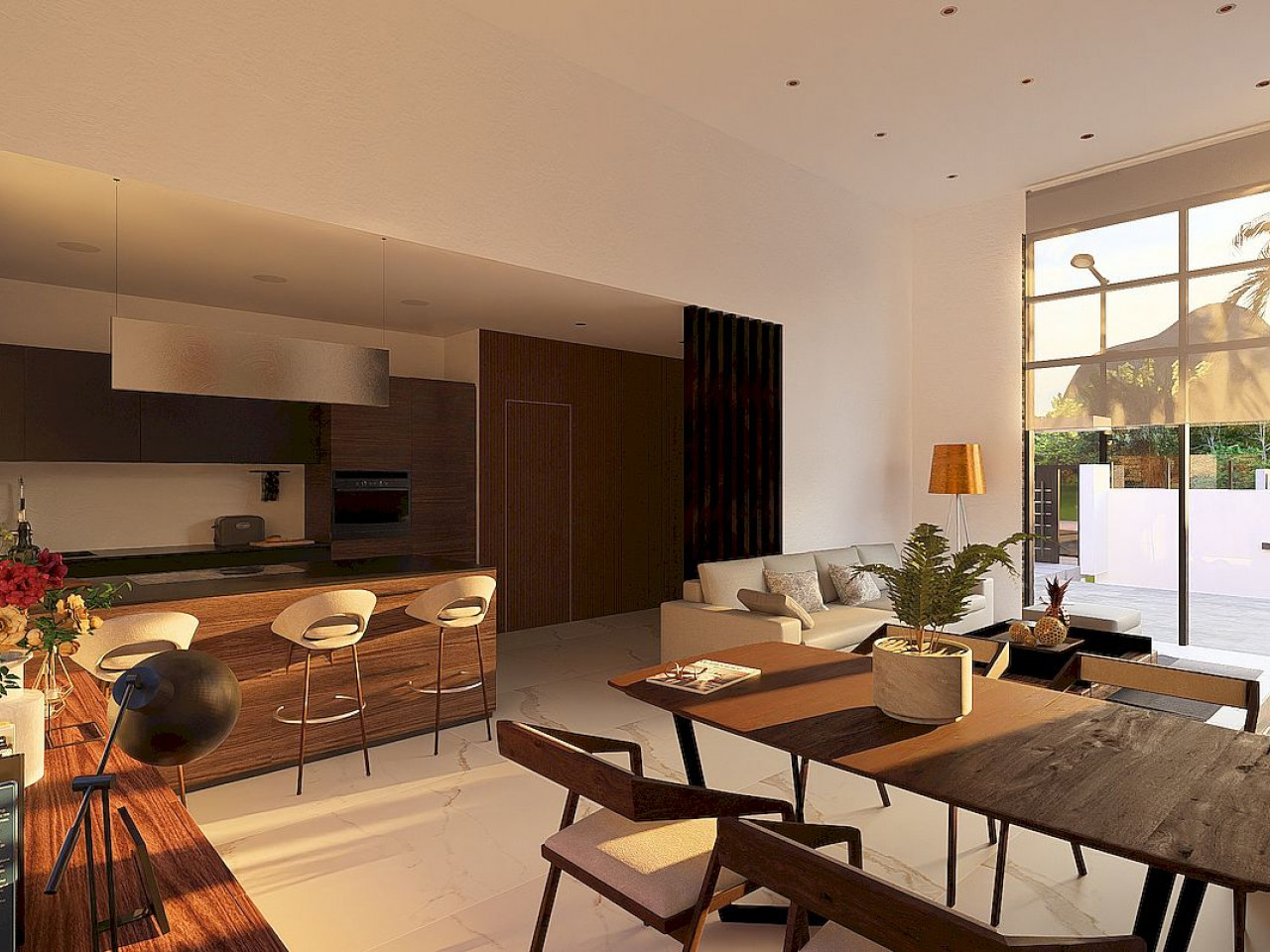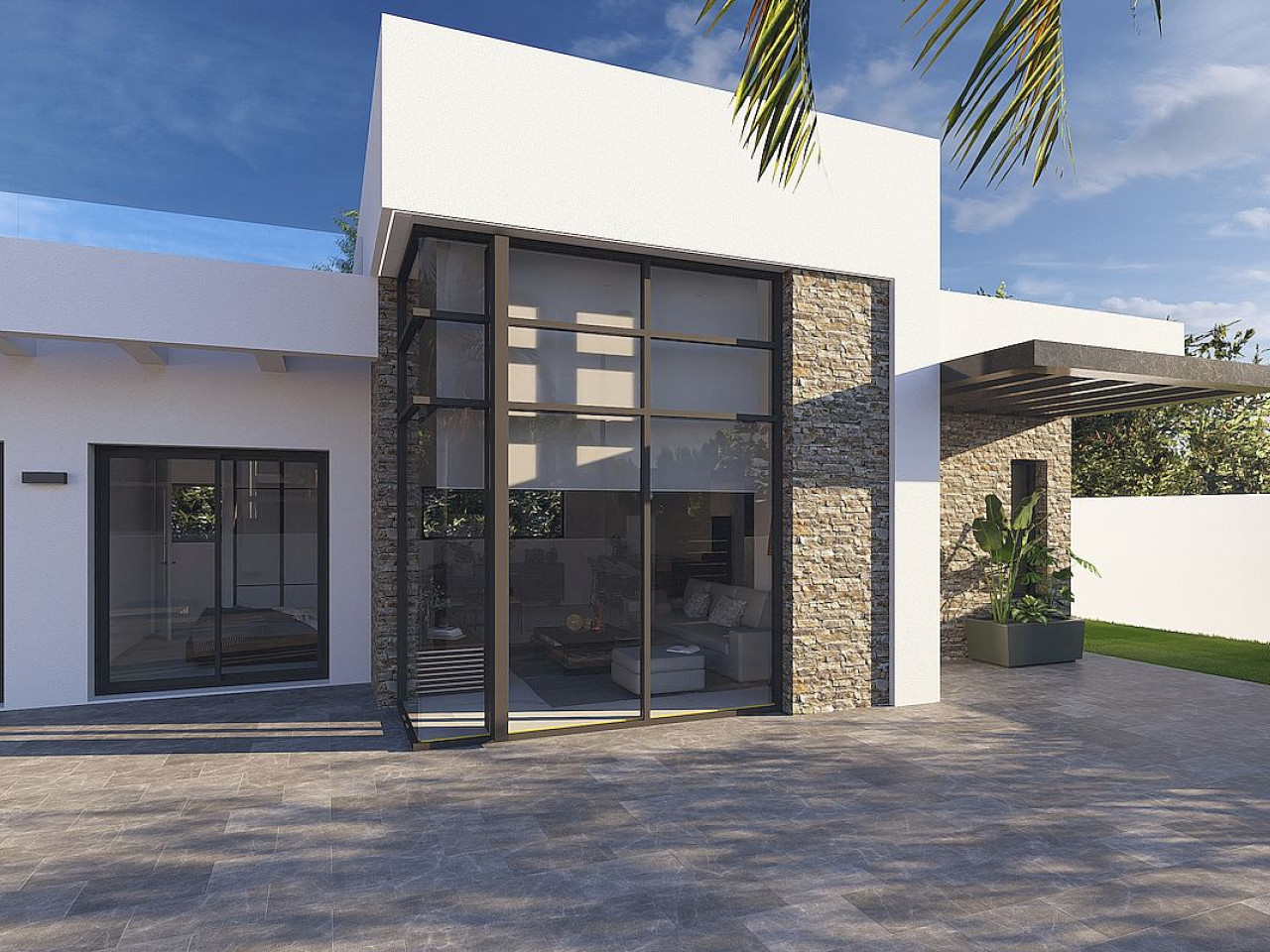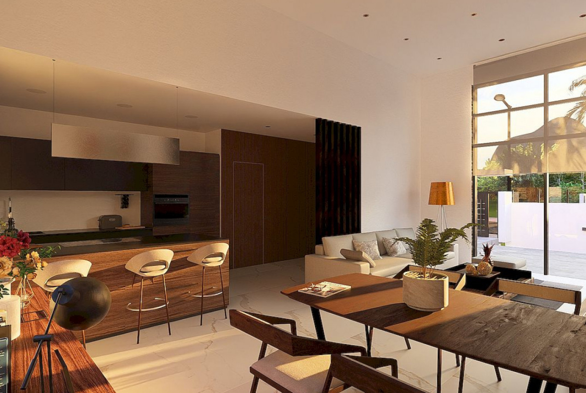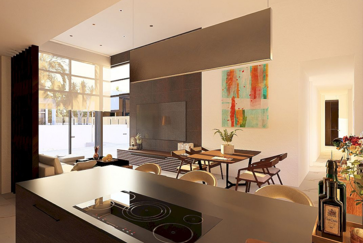 Vila yra vieno aukšto, su cokoliniu aukštu, joje yra 3 miegamieji, 2 vonios kambariai (vienas iš jų – su vonia) ir 1 svečių tualetas. Erdvi atviro plano svetainė jungia modernią, pilnai įrengtą virtuvę su valgomojo ir poilsio zonomis, visos atsiveria į gražią terasą su privačiu baseinu. Yra daugiafunkcis 94 m2 ploto cokolinis aukštas su skalbykla ir garažu dviem automobiliams.