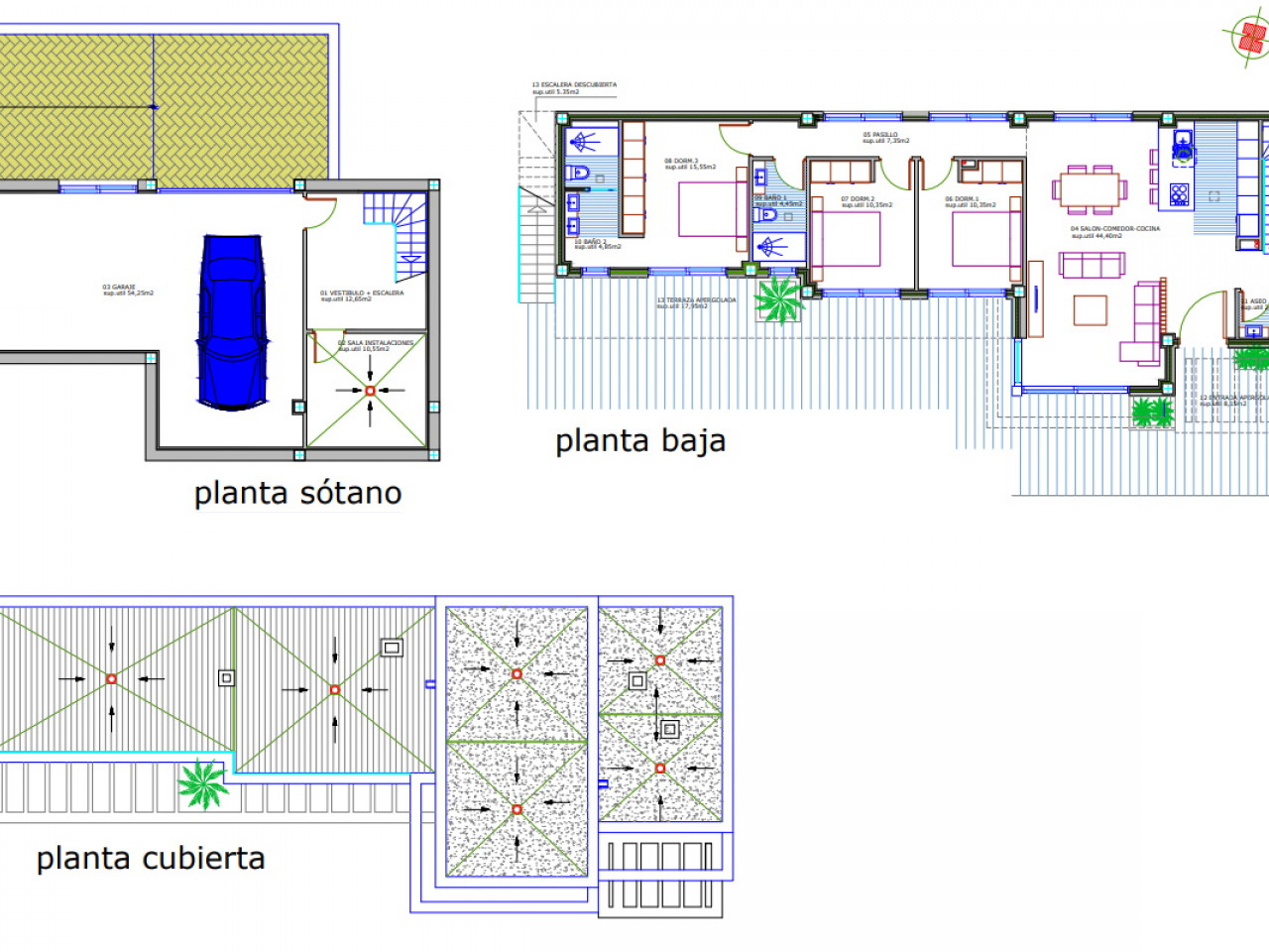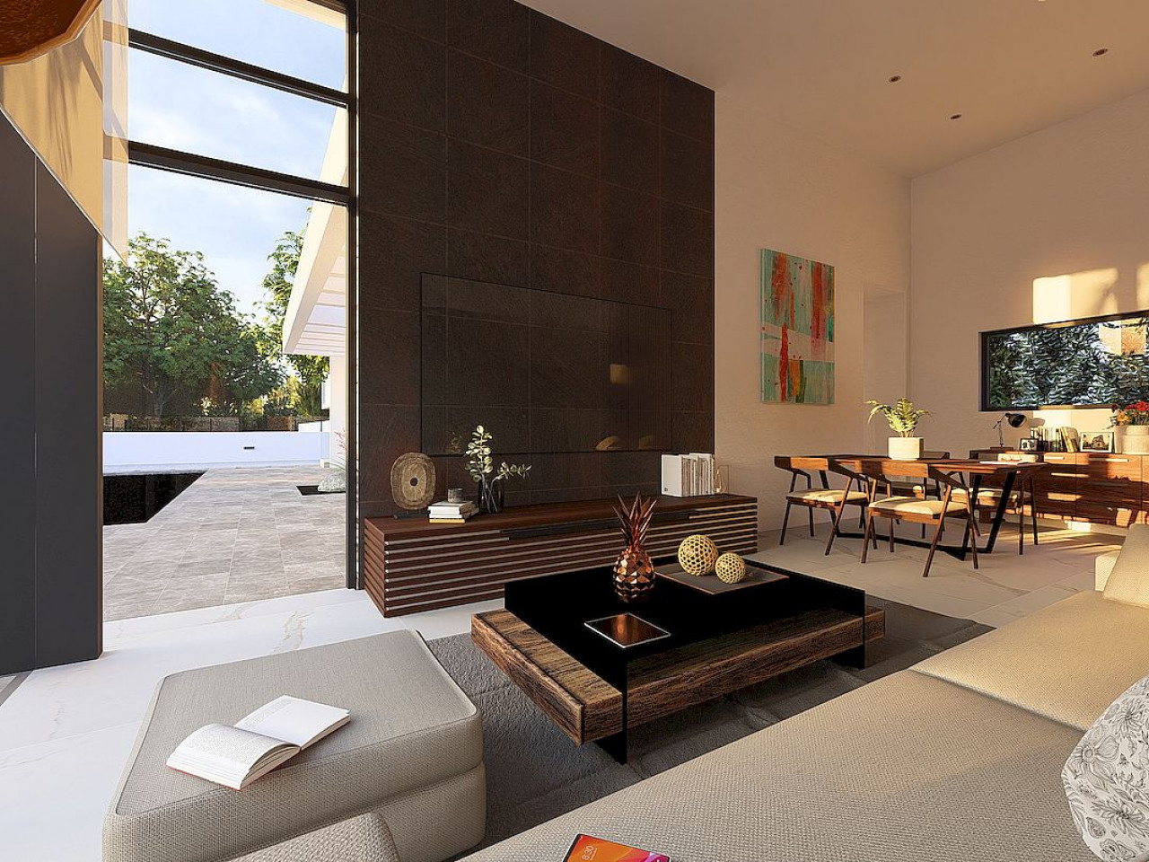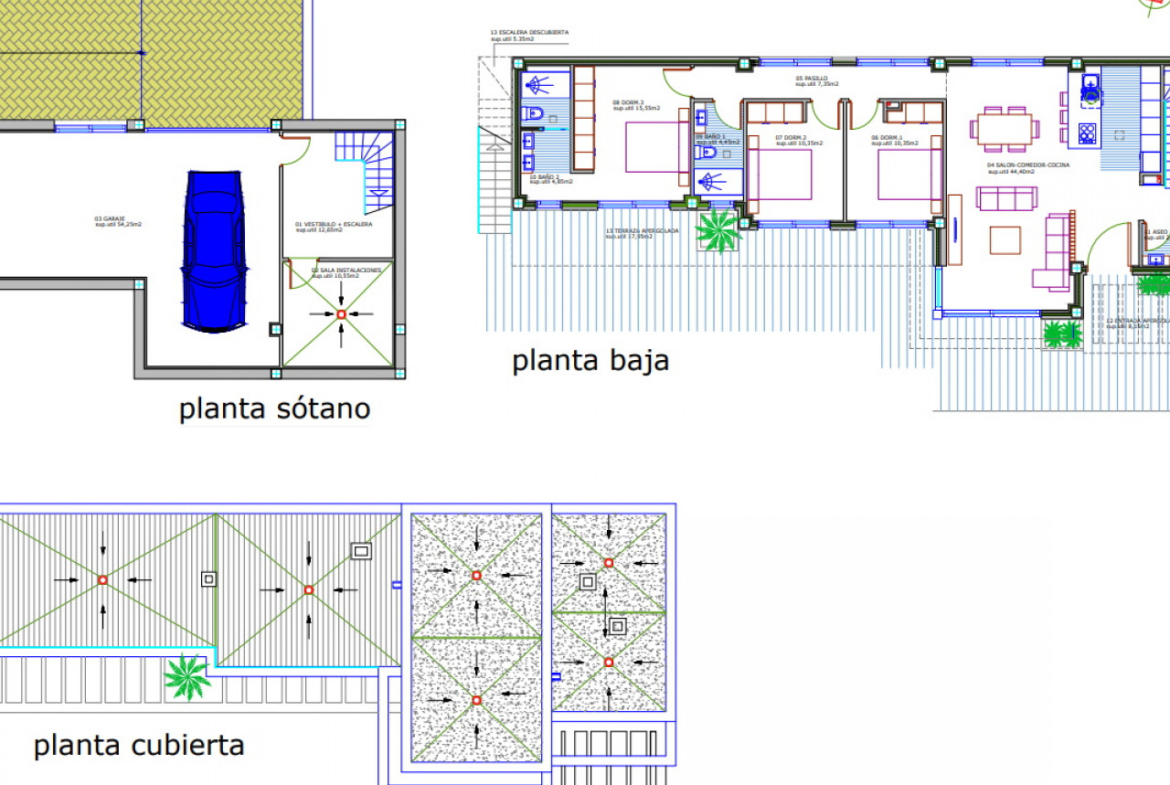Vila yra vieno aukšto, su cokoliniu aukštu, joje yra 3 miegamieji, 2 vonios kambariai (vienas iš jų – su vonia) ir 1 svečių tualetas. Erdvi atviro plano svetainė jungia modernią, pilnai įrengtą virtuvę su valgomojo ir poilsio zonomis, visos atsiveria į gražią terasą su privačiu baseinu. Yra daugiafunkcis 94 m2 ploto cokolinis aukštas su skalbykla ir garažu dviem automobiliams.