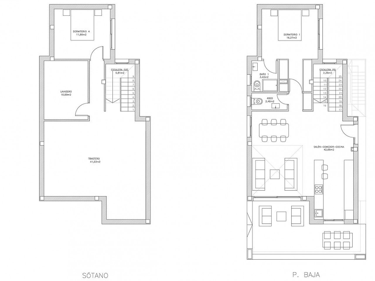 Pirmame aukšte yra didelė svetainė-valgomasis ir atvira virtuvė su išėjimu į priekinę terasą, vienas miegamasis su įmontuota drabužių spinta ir vonios kambarys bei svečių tualetas.