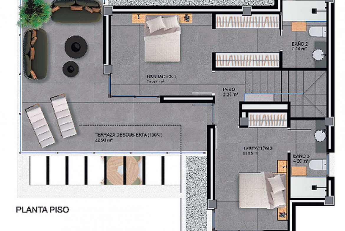 Šioje viloje yra trys dviviečiai miegamieji (su įmontuotomis spintomis ir atskira terasa prie pagrindinio miegamojo), trys vonios kambariai (du atskiri vonios kambariai), pilnai įrengta moderni integruota virtuvė, skalbykla, erdvi atviro išplanavimo svetainė / valgomasis, vedantis į didelę svetainę, priekinė terasa su privačiu baseinu ir soliariumu ant stogo (pasirinktinai), į kurį patenkama iš antro aukšto.
