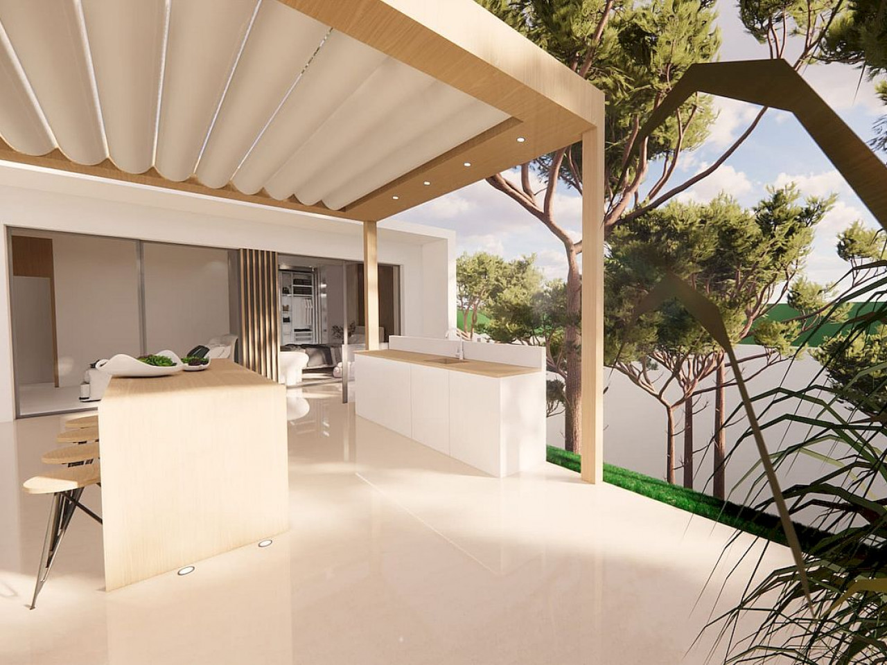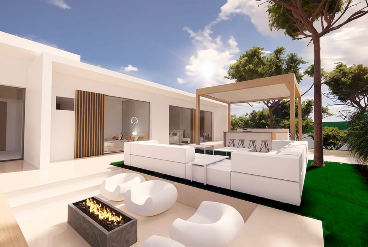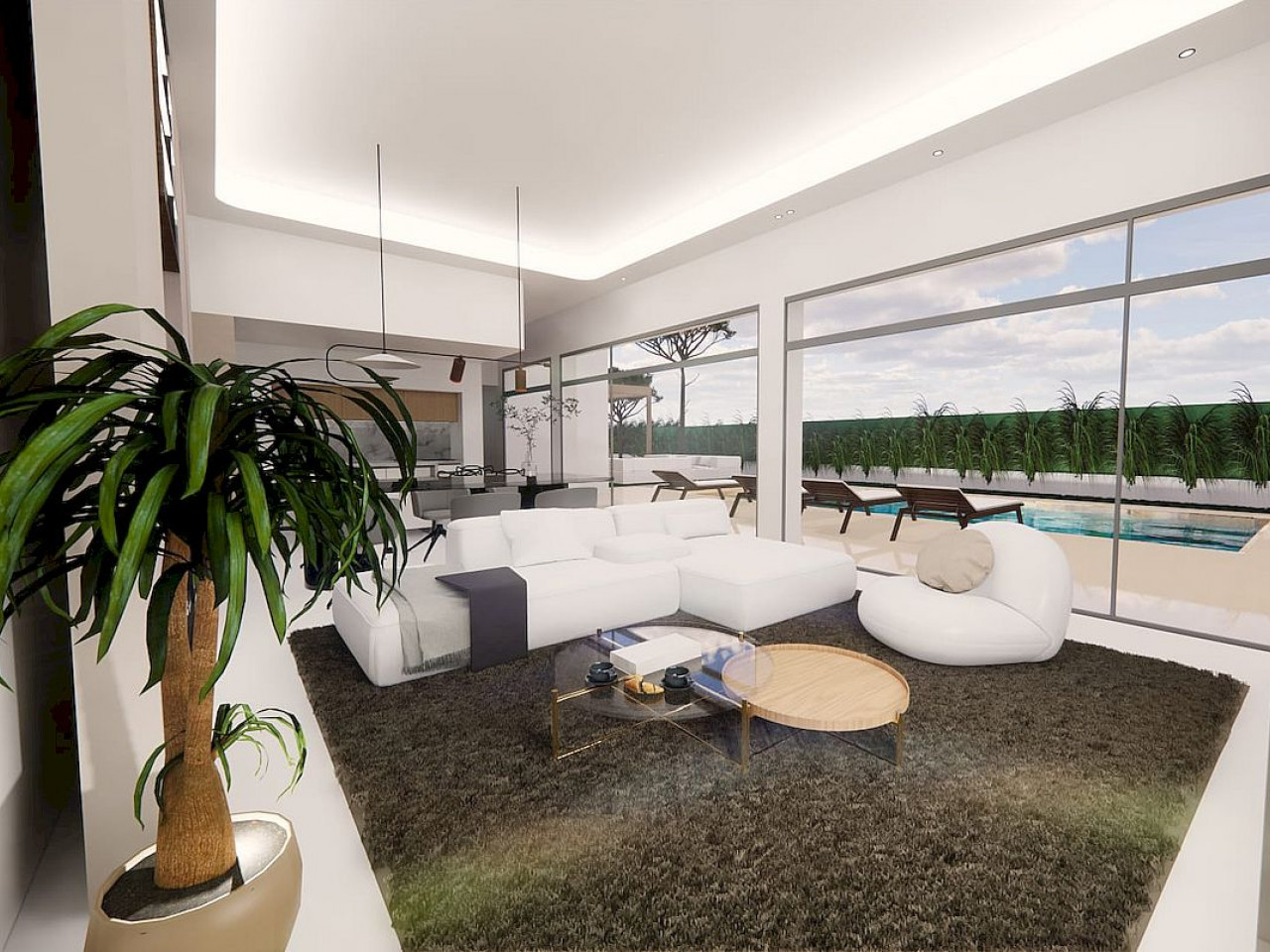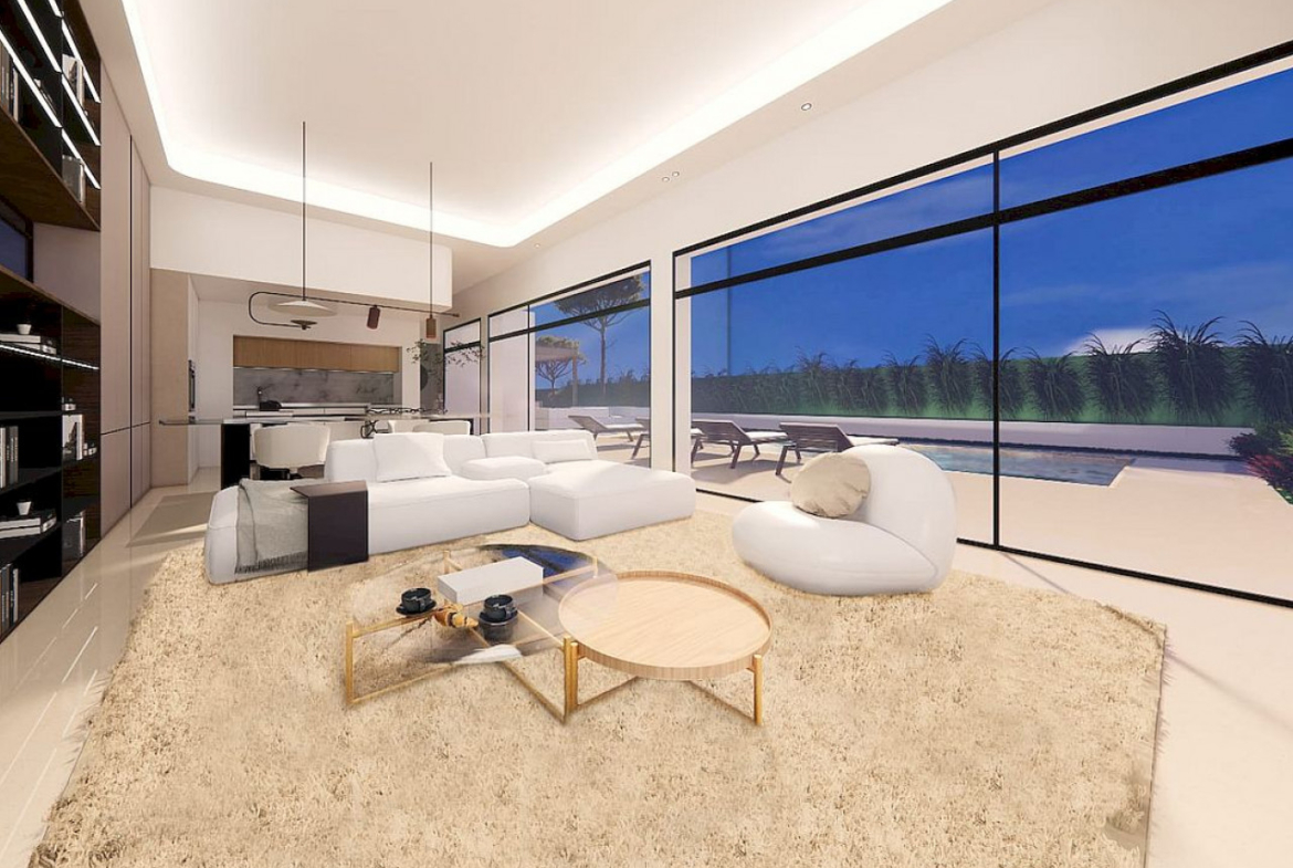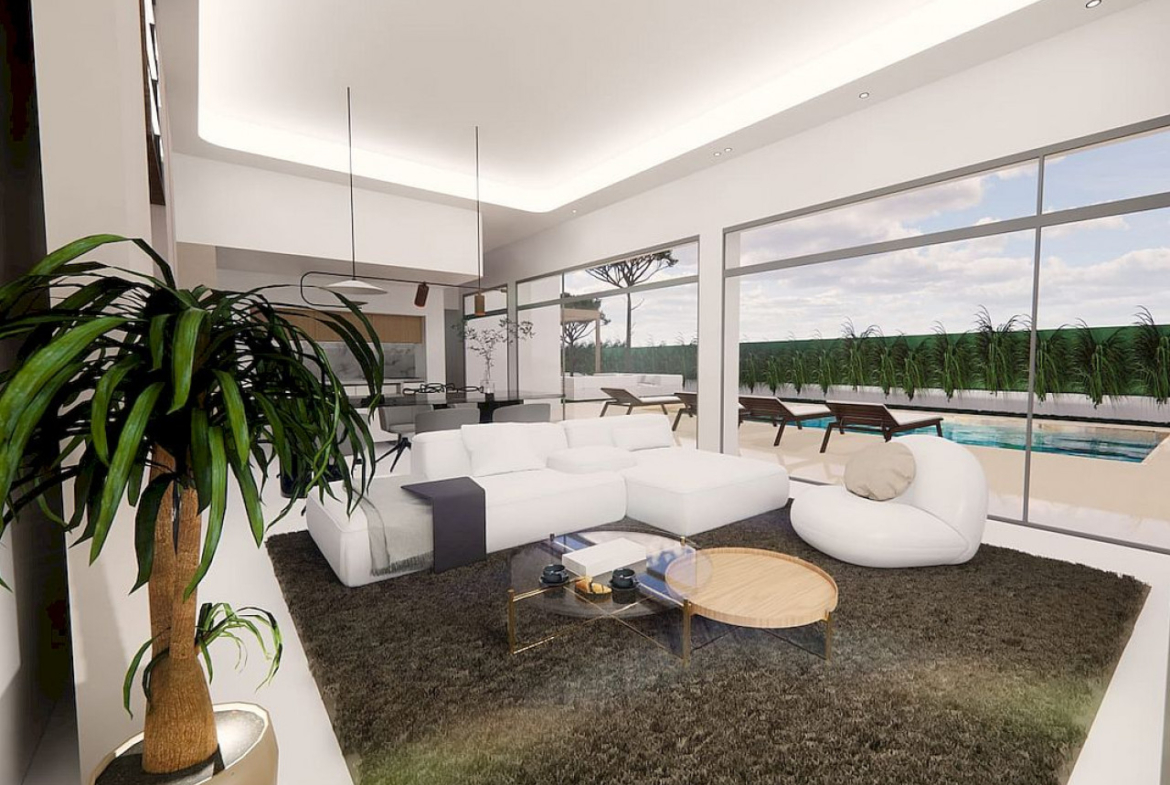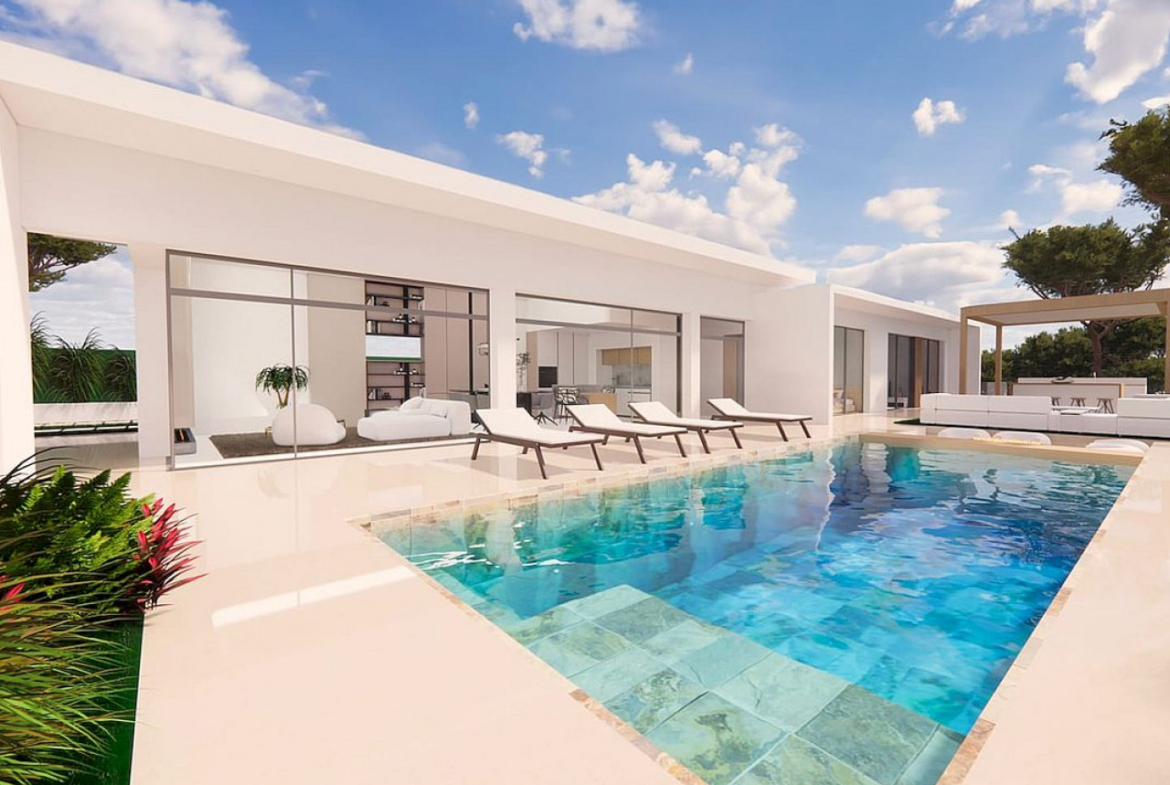 Šiuolaikinės nepriklausomos vieno aukšto vilos su privačiu baseinu, 3 miegamaisiais, 2 vonios kambariais ir svečių tualetu 800 m² sklypuose.