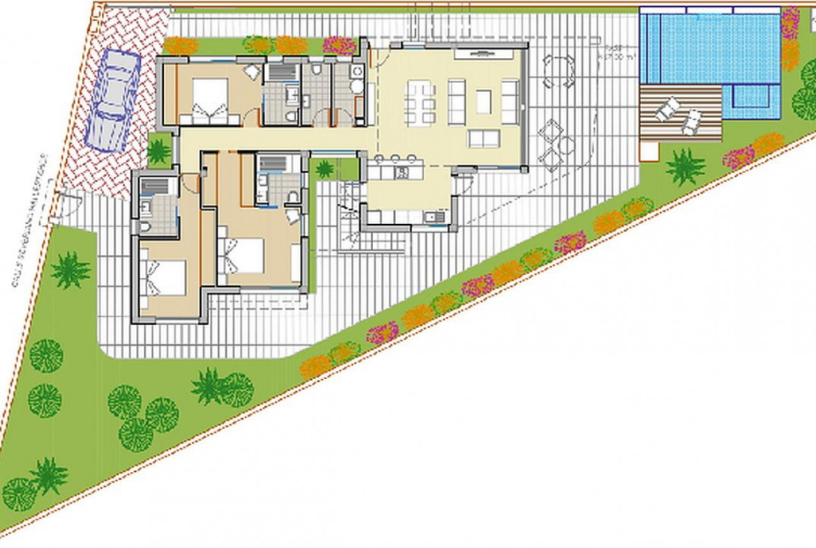Kampinio modelio vila yra dideliame kampiniame sklype saulėtoje pietryčių vietoje su vaizdu į atvirus laukus, golfą ir jūrą. Šioje kampinėje viloje yra 3 miegamieji, 3+1 vonios kambarys, terasa ir soliariumas ant stogo, privatus baseinas ir automobilių stovėjimo aikštelė.