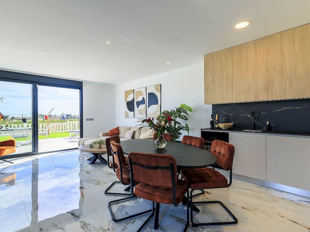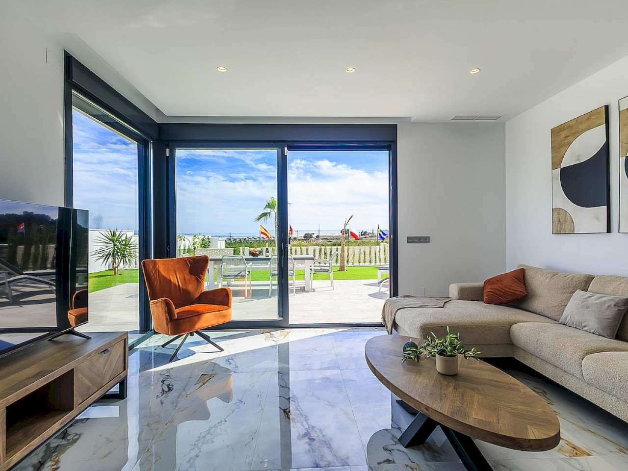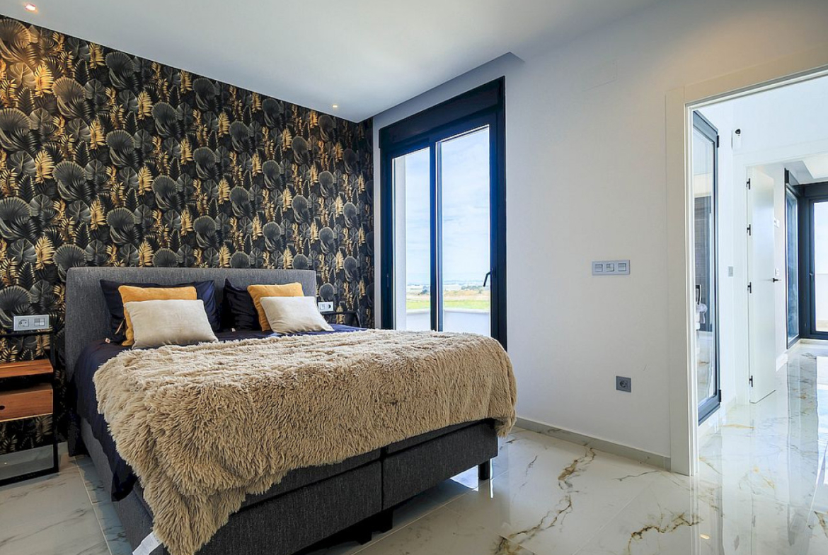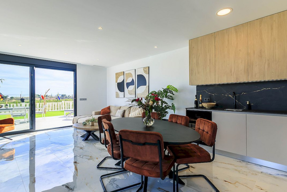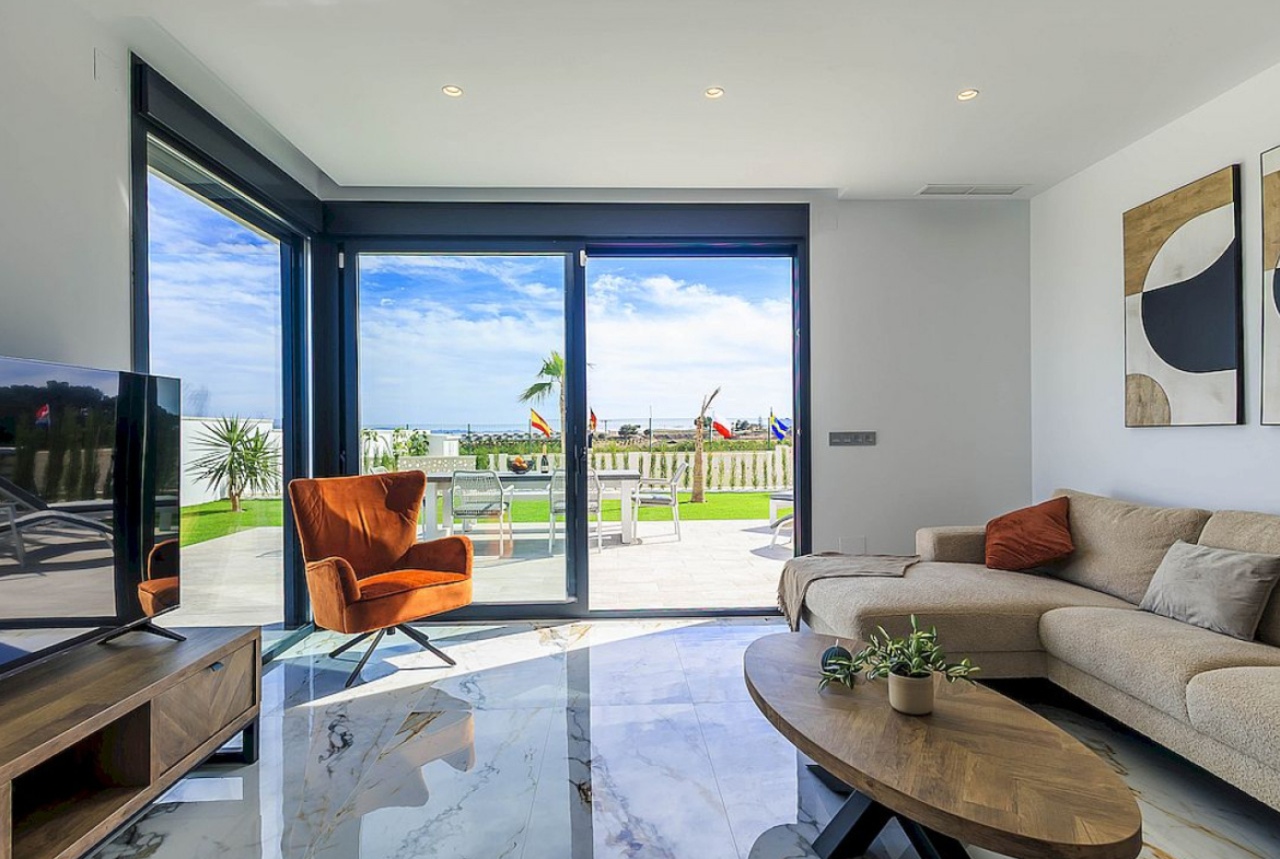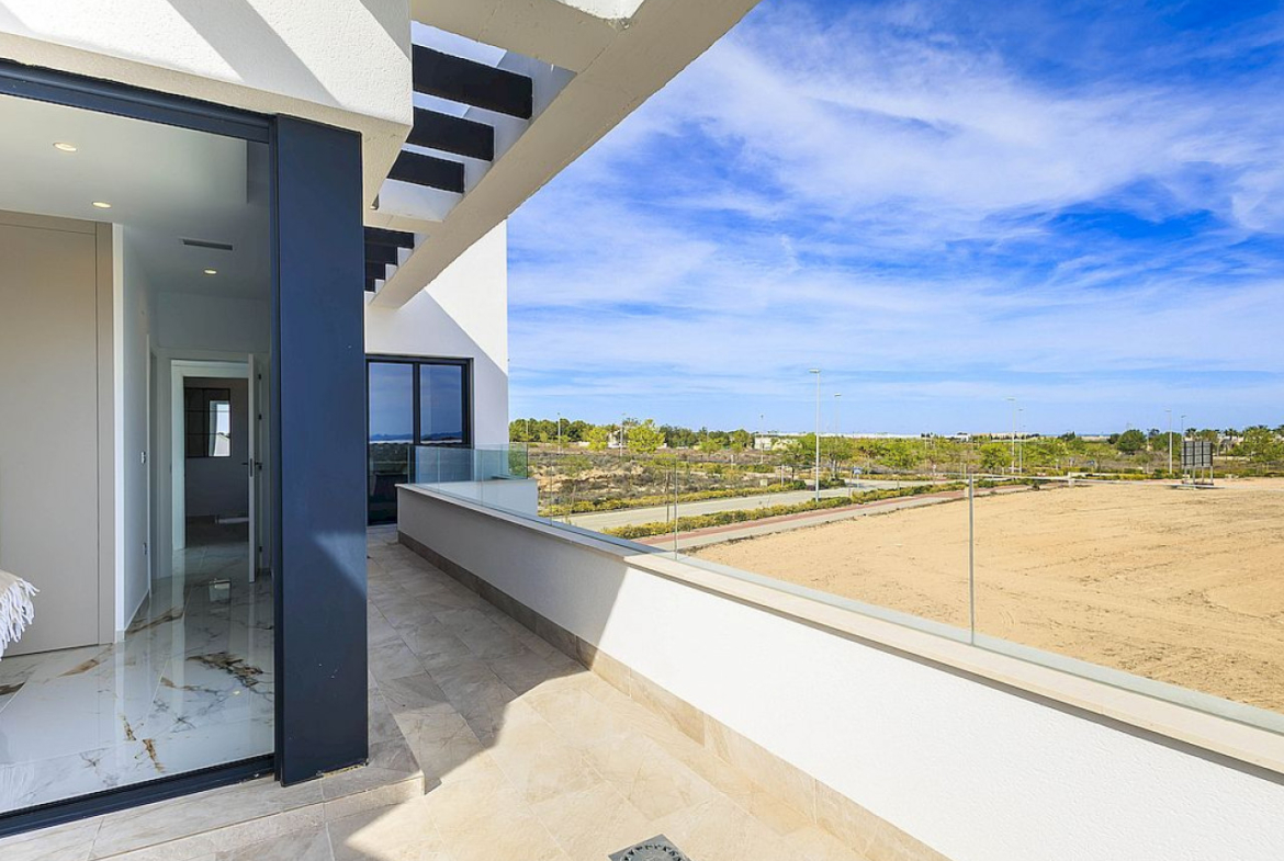 Naujos modernaus dizaino vilos vos 100 m nuo golfo aikštyno su atvirais laukais, golfo ir jūros vaizdais.