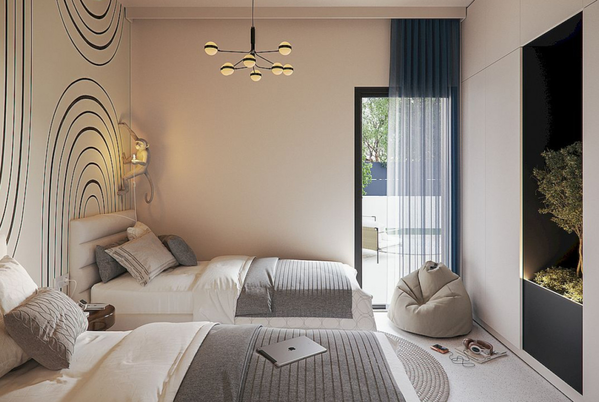 Interjero dizainą sudaro 107 m2 plotas, padalintas į vieną aukštą su didžiuliu privačiu soliariumu, didelė svetainė su integruota virtuve, 3 šviesūs miegamieji, 2 vonios kambariai su moderniomis linijomis ir aukštos kokybės.