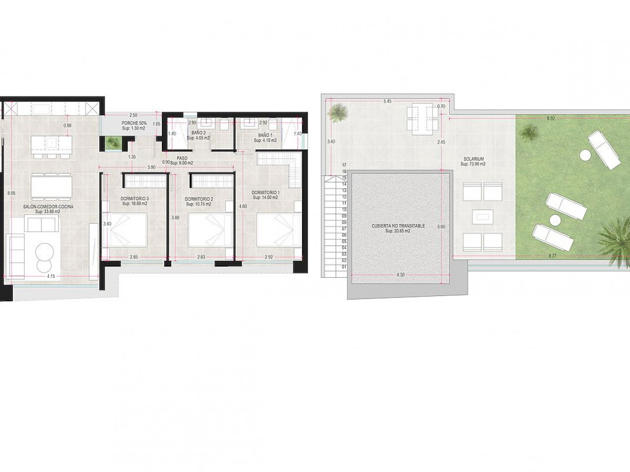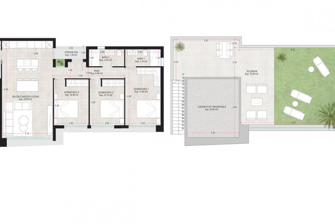 Pagrindinėje zonoje yra atvira dienos erdvė, kurią sudaro svetainė-valgomasis ir virtuvė su dideliais langais, pro kuriuos patenkama į lauko zoną. Šiame aukšte yra miegamasis su atskiru vonios kambariu, du miegamieji su tiesioginiu išėjimu į sodą, vonios kambarys ir skalbykla. Visose vilose yra 53 m2 stogo terasa su vaizdu, automobilių stovėjimo aikštelė sode ir 21 m2 baseinas.