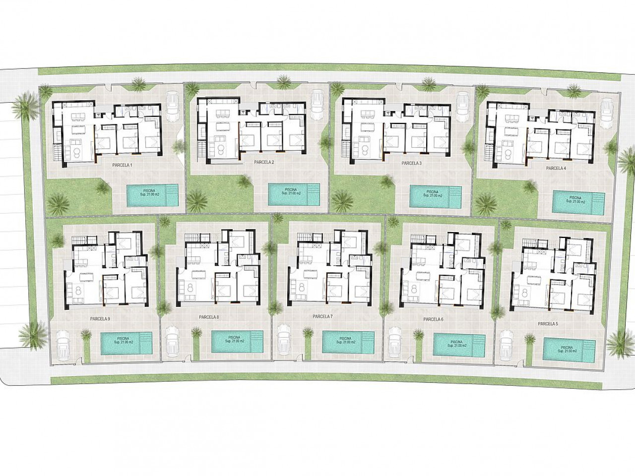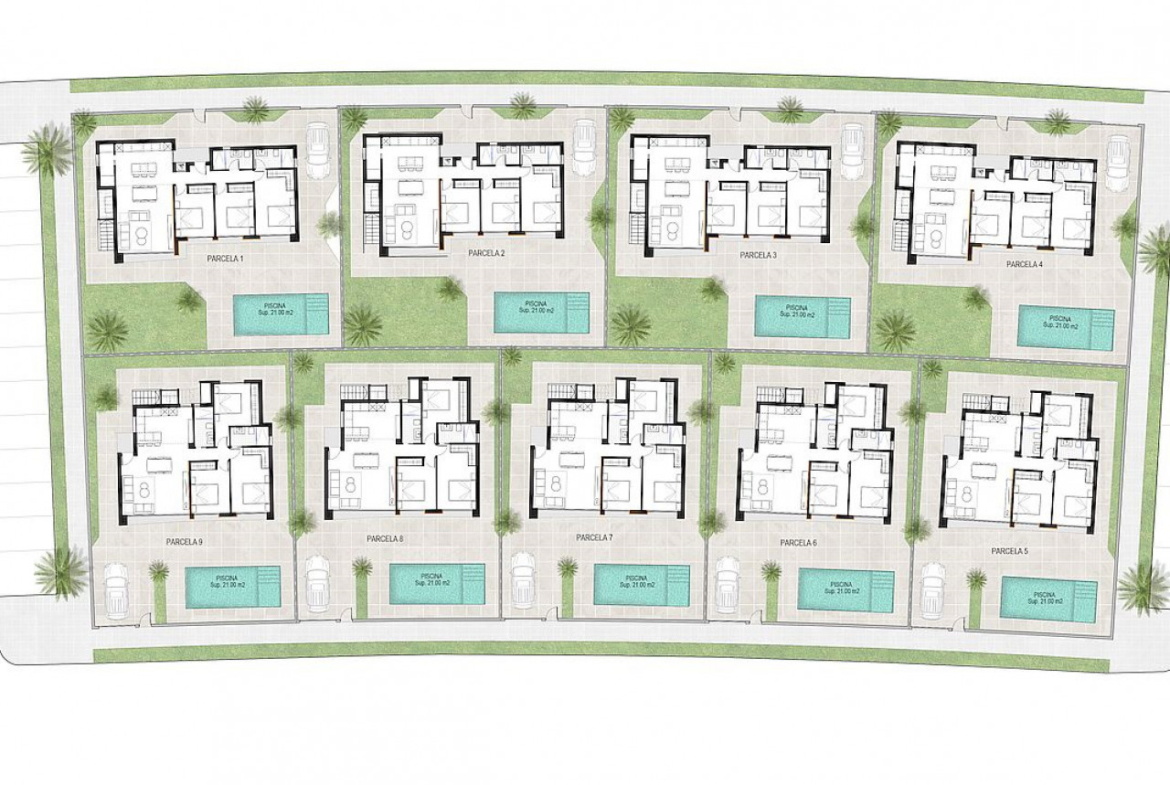 „Residential Oriol“ kompleksą sudaro 3 miegamųjų ir 2 vonios kambarių vieno aukšto atskiros vilos, esančios „Condado de Alhama“ golfo kurorte Alhama de Mursijoje.