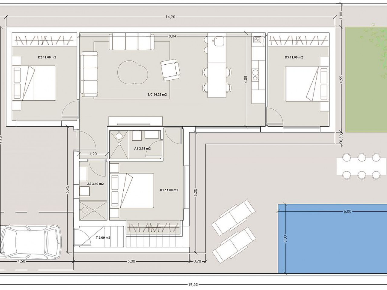 Su dvigubomis pilno stiklo stumdomomis durimis, kurios atsiveria tiesiai į didelę terasą su privačiu baseinu, uždaru sodu ir vieta automobiliui.