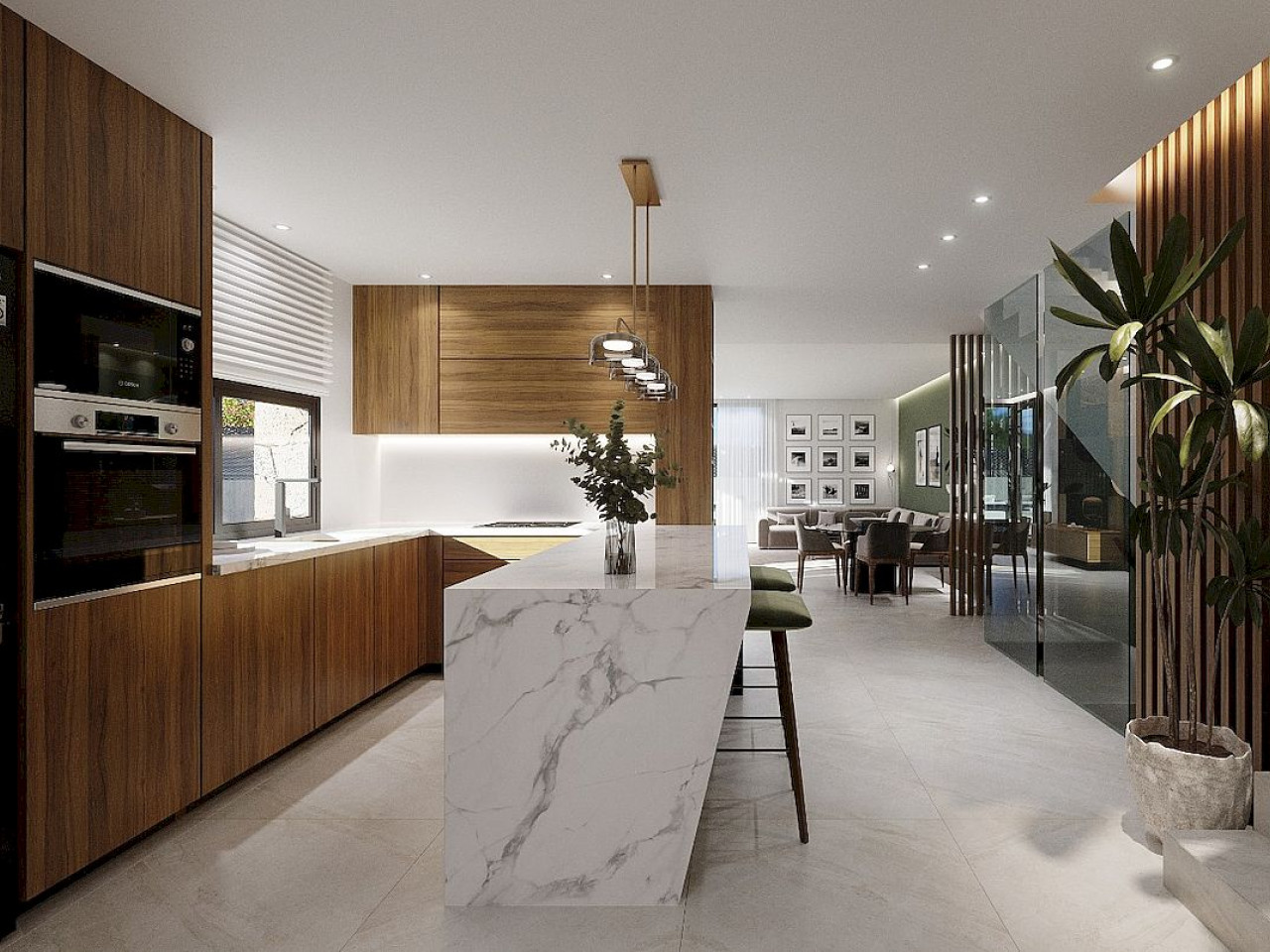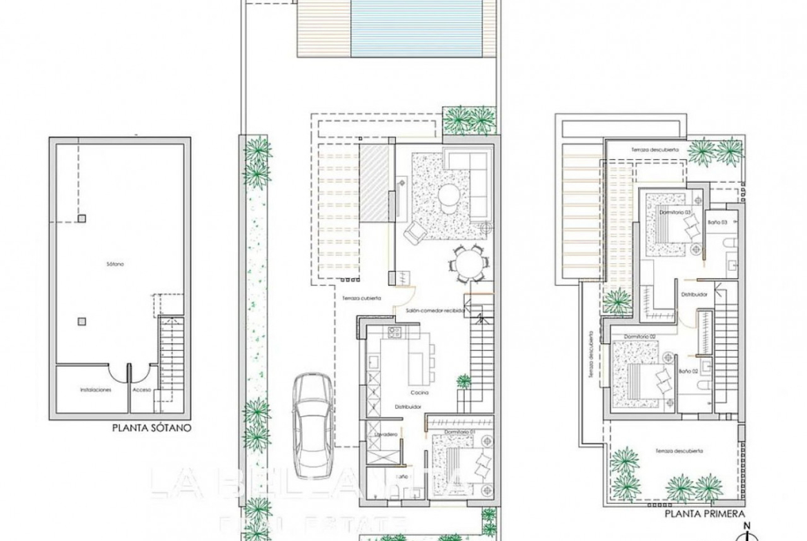 Vilos pastatytos per 3 aukštus, jose yra 3 miegamieji, 3 vonios kambariai, atviro plano virtuvė ir svetainė-valgomasis, įmontuotos drabužių spintos, rūsys, privatus sodas su baseinu ir vieta automobiliui.