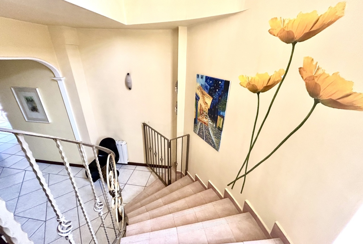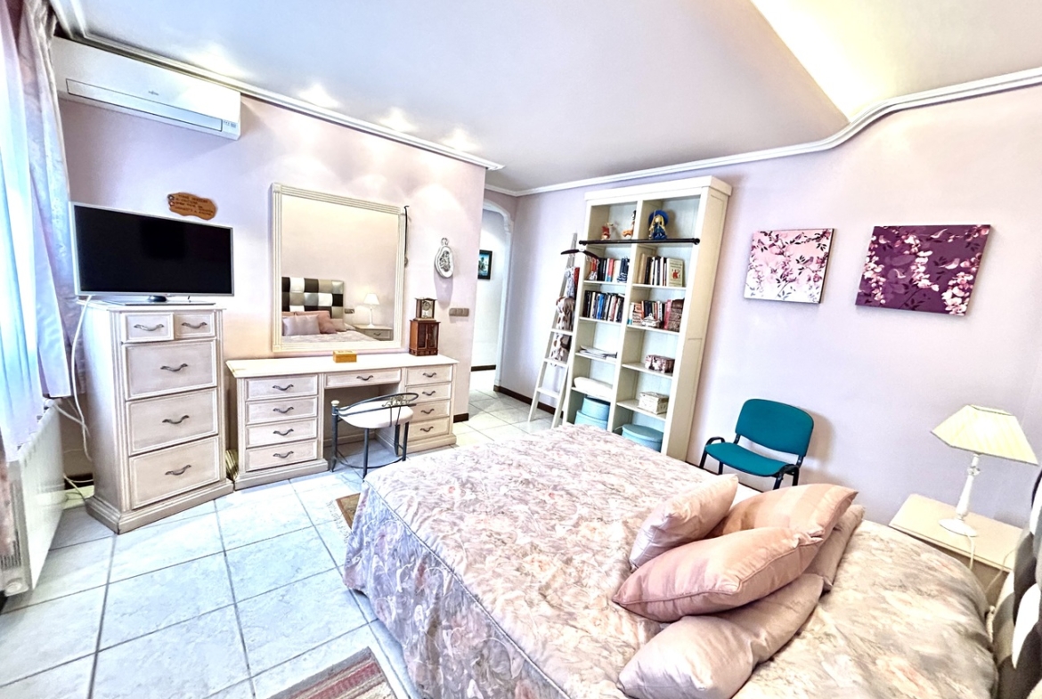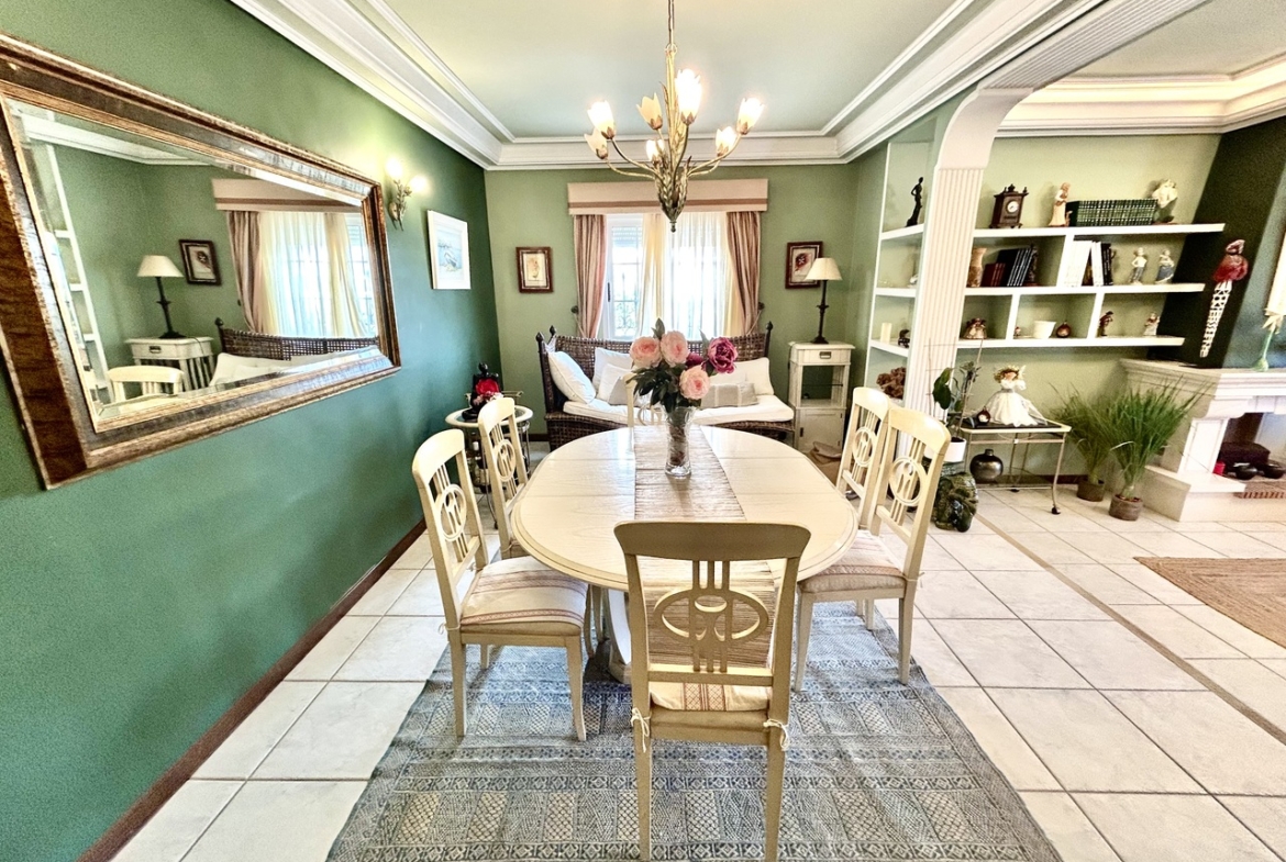 Outside, the villa offers a stunning private swimming pool surrounded by a lush, mature garden—perfect for relaxing in complete privacy. A welcoming covered porch and a pergola with built-in barbecue create the perfect setting for outdoor dining and memorable family or social events.