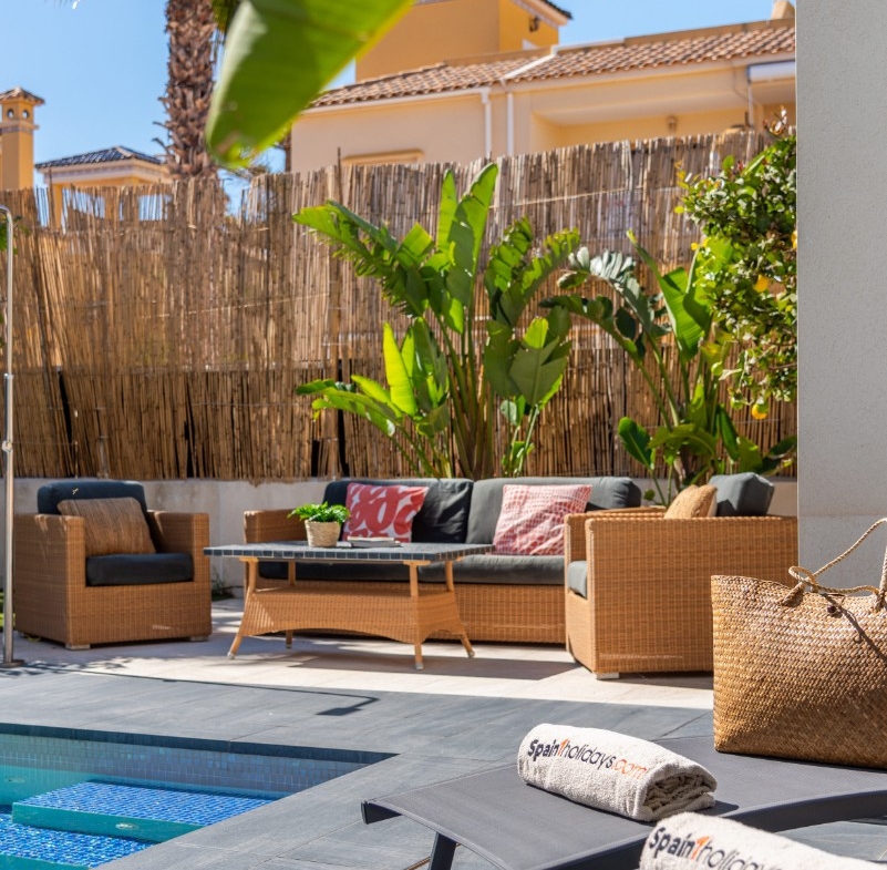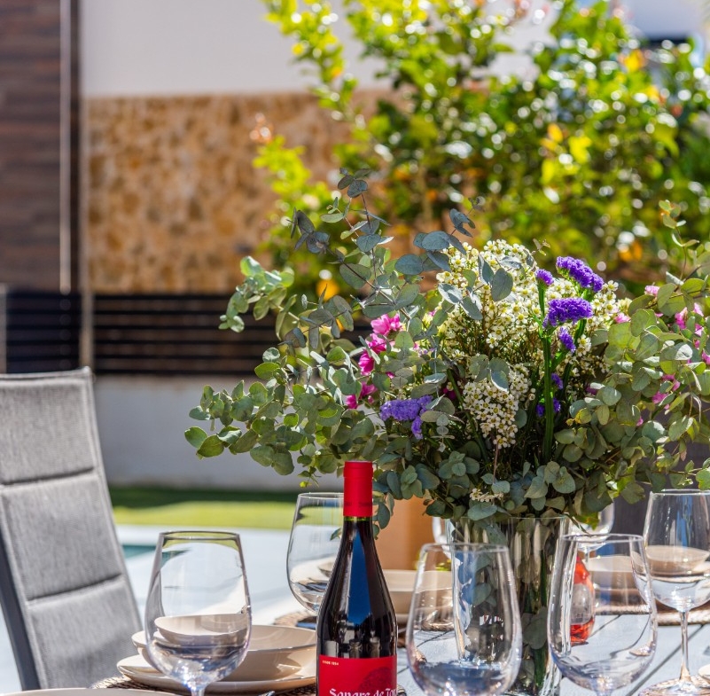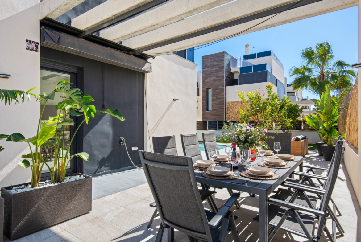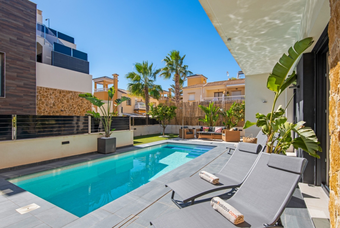 This modern villa, completed in 2019, is located in the sought-after area of Lomas de Cabo Roig. Thanks to its south-facing orientation, the property enjoys sun on the pool and garden from early morning until late afternoon.The villa is situated on a corner plot offering ample outdoor areas. Upon entering the property, we find a private pool surrounded by enough space for sun loungers, a seating area, and an outdoor dining area. The corner position guarantees sun throughout the day, making it the perfect place to enjoy the Mediterranean lifestyle.Inside, the house is distributed over several floors, designed to combine comfort and modernity. The main floor features a bright living-dining room with an open-plan kitchen. The large sliding windows and double-height ceiling create a feeling of spaciousness and light. On this level, there is also a bedroom and a bathroom with a shower.On the first floor, there are two spacious bedrooms, each with its own bathroom, as well as direct access to a sunny terrace. From here, a staircase leads to the impressive 60 m² solarium: a private and sheltered space to enjoy the sun and relax with family or friends throughout the year.The semi-basement offers a fourth bedroom along with a large living room and a full bathroom. This level provides a lot of flexibility and is especially suitable for families.With its contemporary design, excellent sun orientation, private pool, and spacious indoor and outdoor spaces, this villa represents a magnificent opportunity to acquire a modern home in one of the most attractive areas of the Costa Blanca.